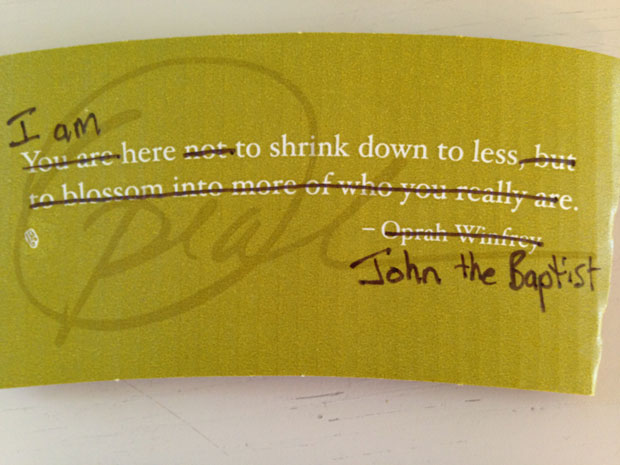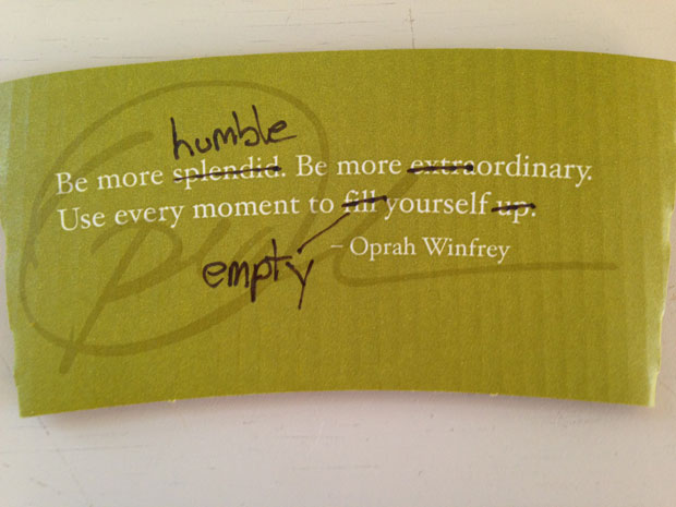 And my suffering increased. As the weeks passed, Starbucks continued printing Oprah quotes trumpeting a Disneyfied gospel of self-actualization. Then I realized that the solution was right in front of me. Oprah’s quotes weren’t that bad; they just needed a little editing. And guess what I do for a living? I edit stuff! So I applied my craft to make Oprah’s life lessons less grandiose and (hopefully) a little more biblical.