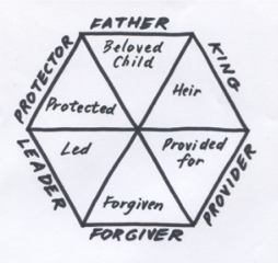 To the hexagon I added what each of God’s roles says about us—if he is Father, I am a beloved child (Gal. 3:26). If he is King, I am an heir (Rom. 8:17; Gal. 4:7), and so on. The power of this exercise became especially clear to me when my small group taped out a large version of the hexagon on the floor and sat in it together, one segment at a time. After taking a few minutes of silence in each segment, we talked about how hard or easy it was to receive that aspect of our relationship with God before moving on through the hexagon. It was astounding to see how segments that were hard for me to receive were perfectly obvious to others. And they, on the other hand, struggled in the segments where I was perfectly comfortable.