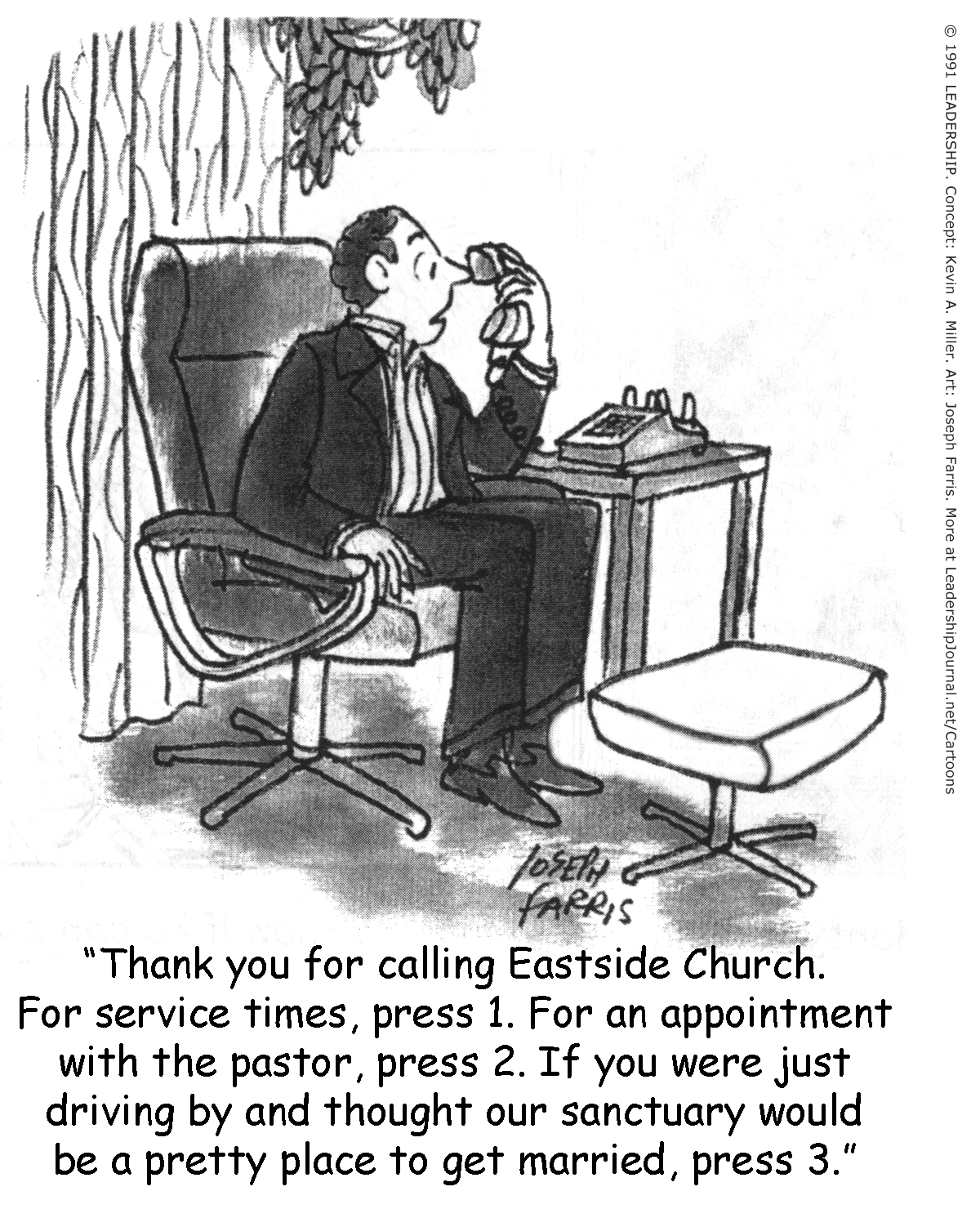 Thank you for calling Eastside Church. For service times, press 1. For an appointment with the pastor, press 2. If you were just driving by and thought our sanctuary would be a pretty place to get married, press 3.