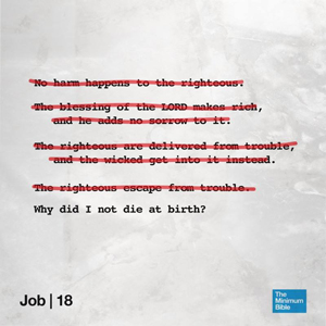 In the "Job" image, four statements each taken from the book of Proverbs are written and crossed off harshly in red ink. All that remains is the fragment of Job's early lament: "Why did I not die at birth?" One of the striking literary aspects about Job is how it basically functions as a rebuttal of much of the other Wisdom literature. In the Hebrew Bible, Job is grouped in with Psalms and Proverbs in a subdivision called the "Book of Truth (EMETH, in Hebrew, one consonant each for Psalms (T), Proverbs (M), and Job (E)." And while Psalms and Proverbs are both relentless in their confidence that God will not unfairly burden the righteous, but punish the wicked, Job is included as a reminder that this is not always the case, that sometimes the righteous do suffer, and sometimes it falls outside our perception to understand why. So for my design, I wanted to be sure to include this literary perspective on Job by referencing other Wisdom literature and showing how Job is essentially crossing off those fragments as "questionable guarantees."