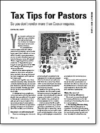 Your income tax forms for 2000 have just arrived in the mail, and already you're about to miss your best opportunity to save money next year. You probably have many questions: should I call an accountant or employ a pencil and a large eraser? Can I deduct my home office? Should I claim depreciation on my ministry-related computer or take the first-year write-off instead? Those are good questions, and the answer is—it depends. But your largest tax savings potential for 2000 has nothing to do with how your return is prepared. After-the-fact planning has little impact on taxes once income has been received, a housing allowance has been designated, and expenses have been paid. As you pull together your W-2s, itemized deduction data, receipts for unreimbursed expenses, notations of your honoraria and fee income, you need to consider the best approach for the tax return you will file in April 2002. A representative or a small committee representing the lay leadership should meet annually with the pastor to discuss pay expectations, review past pay patterns, and examine the tax consequences of compensation components before the compensation package is finalized. If you haven't done that for 2001, now is the time.