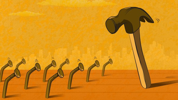 "Imagine a ball, hanging from a large number of thin cotton strings. The ball is 1,000 pounds. Each individual string can only hold approximately 5 to 10 pounds without breaking, but with around 200 strings attached, the ball is held up. Now imagine, one by one, the strings begin to get cut. After the first string is cut, nothing happens. After the 2nd, the 3rd, the 10th, the 20th, still nothing happens. But as the number of total strings reduces, the likelihood that the next cut string will cause everything to fall, increases.